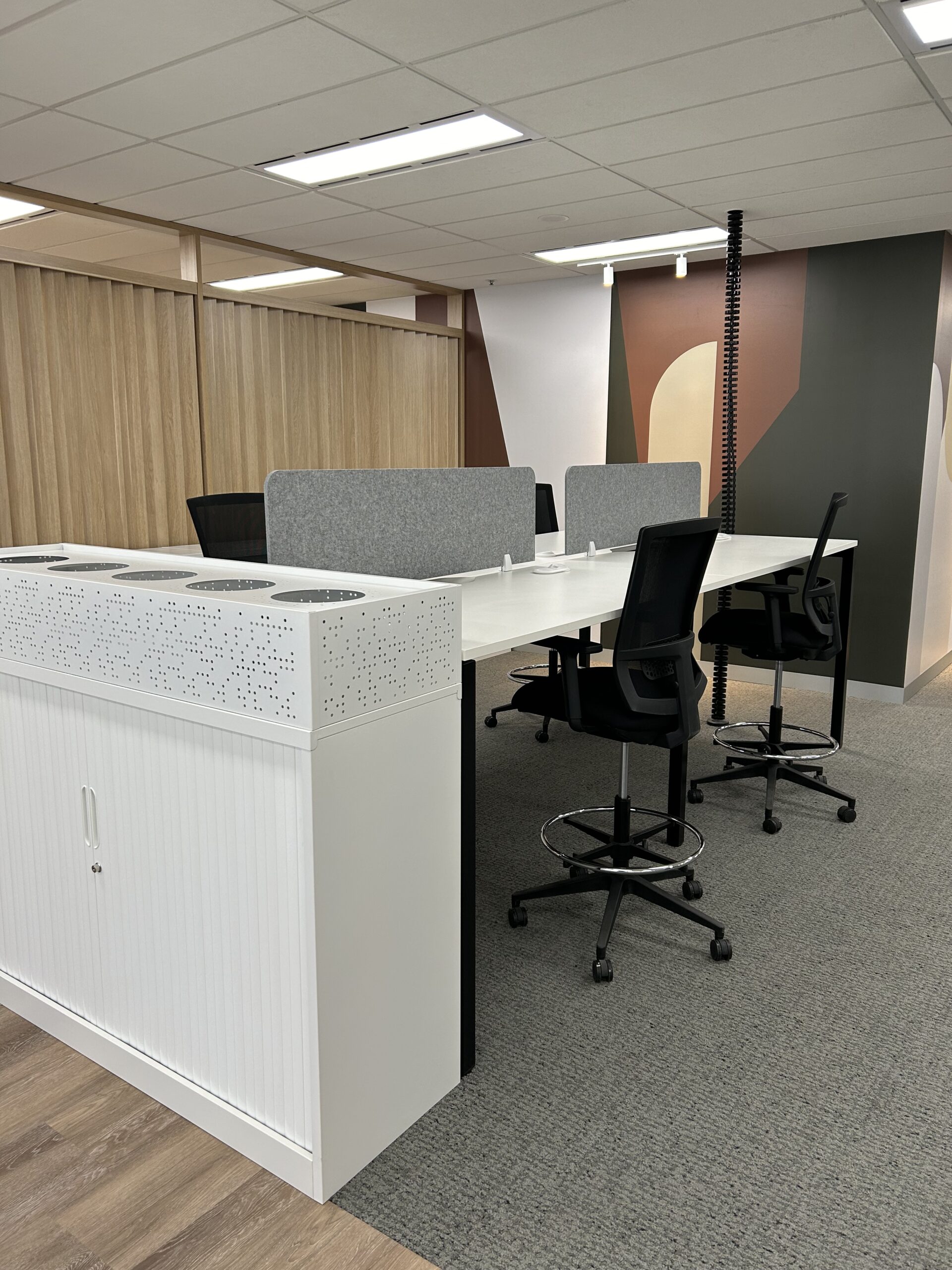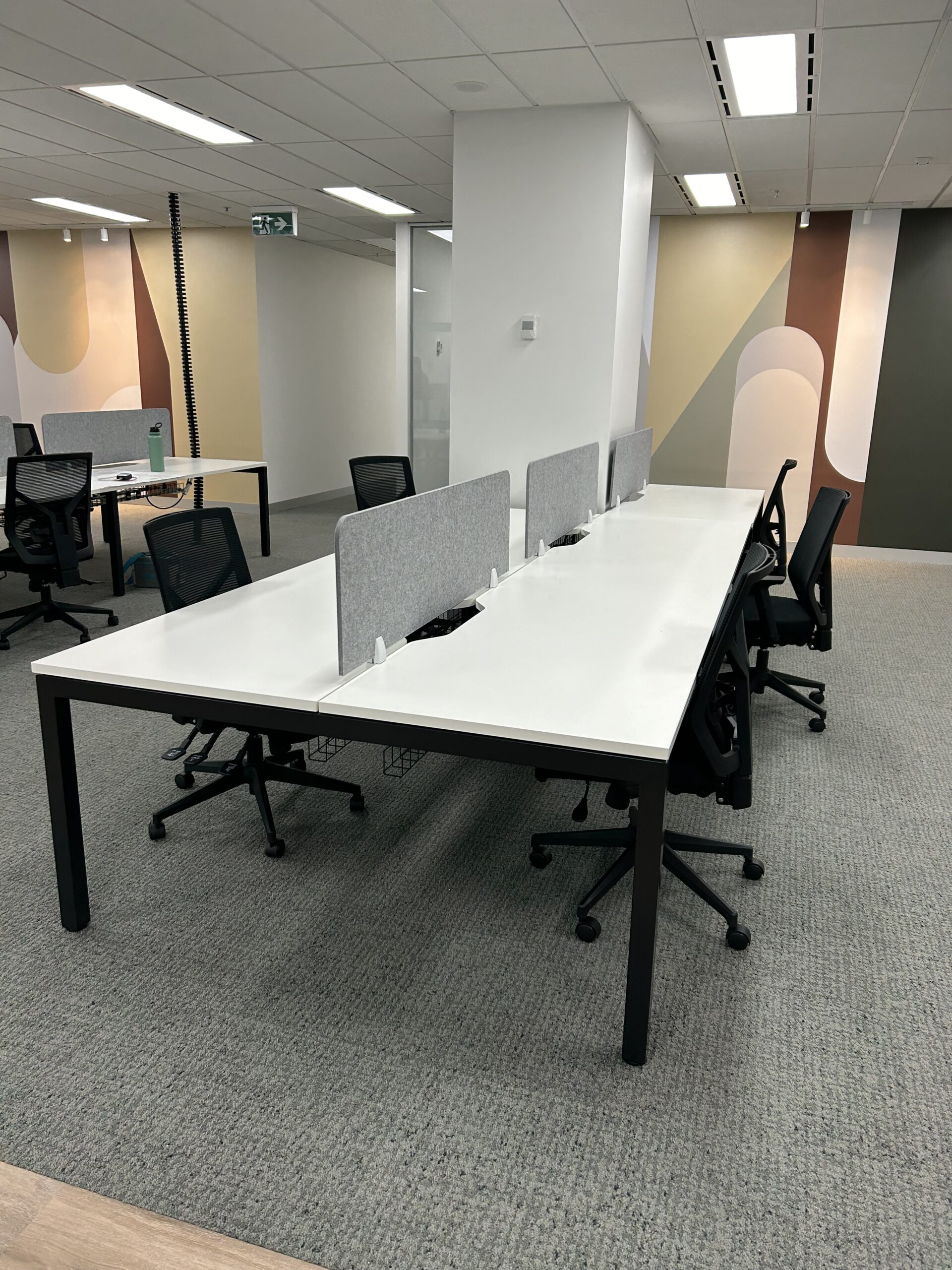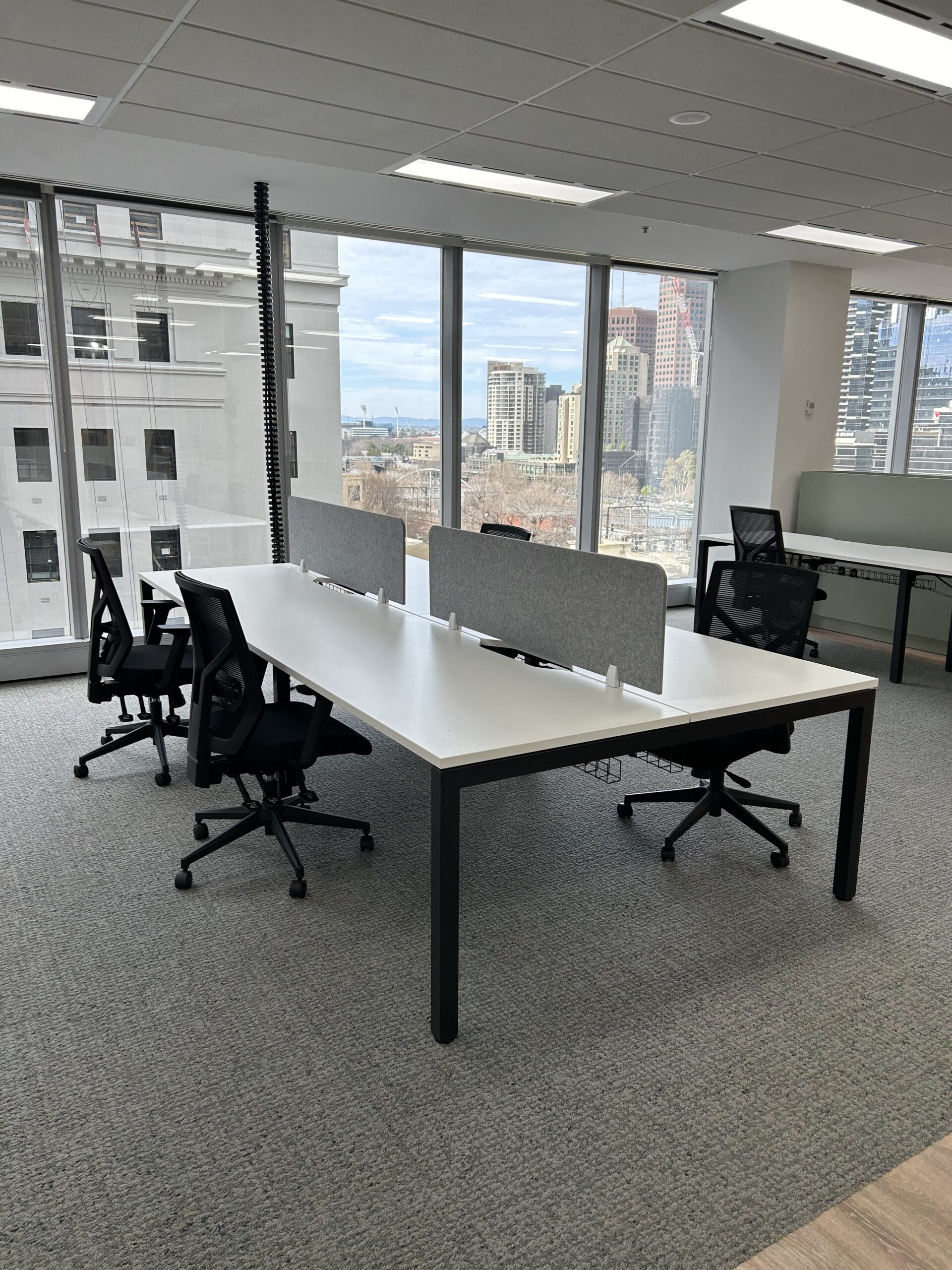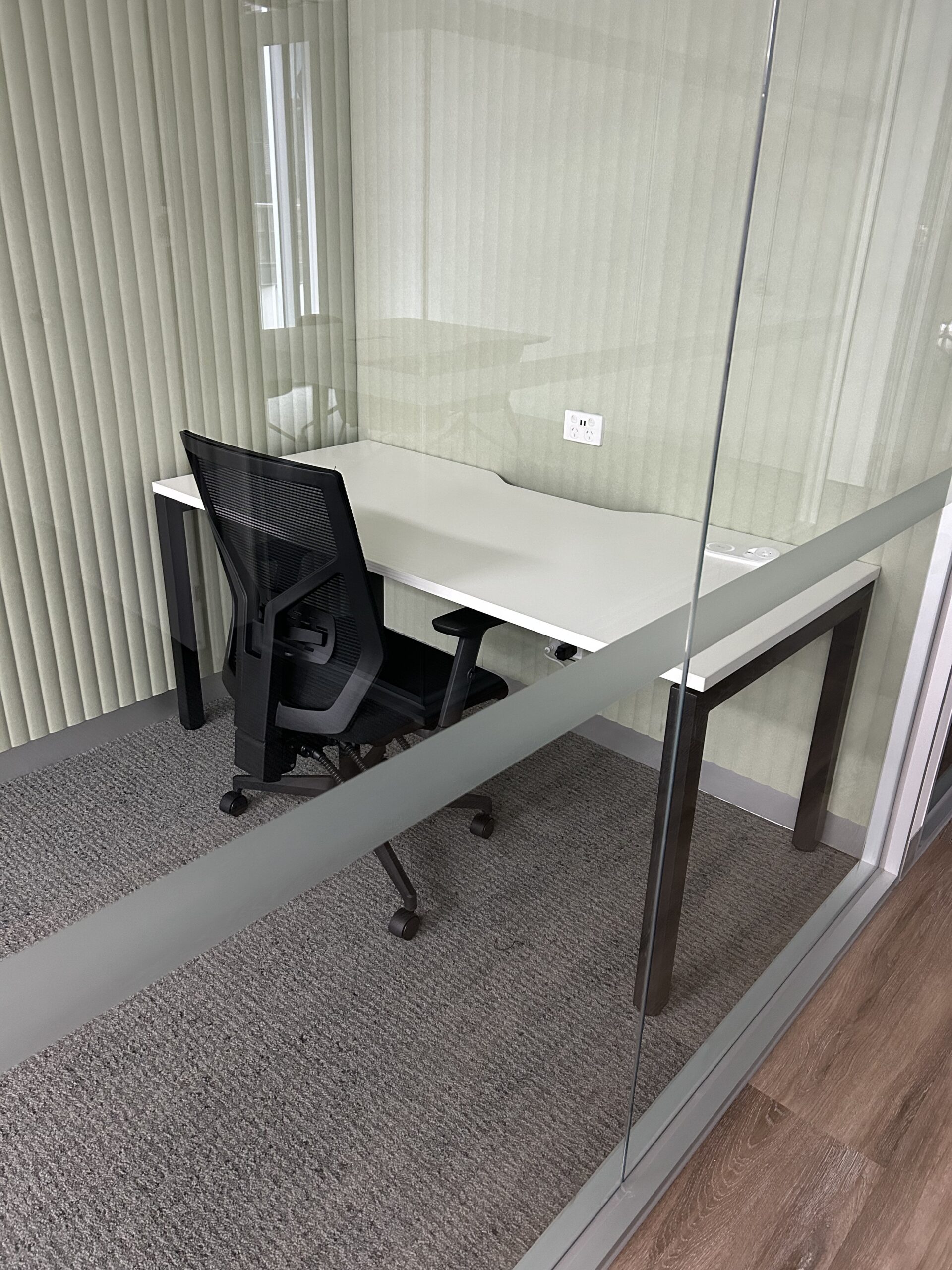 A fully fitted spec suite delivering a complete office environment, featuring a mix of sit-to-stand workstations, custom upholstered boardroom chairs and a dedicated focus room desk. Designed to support flexibility, comfort and everyday functionality.